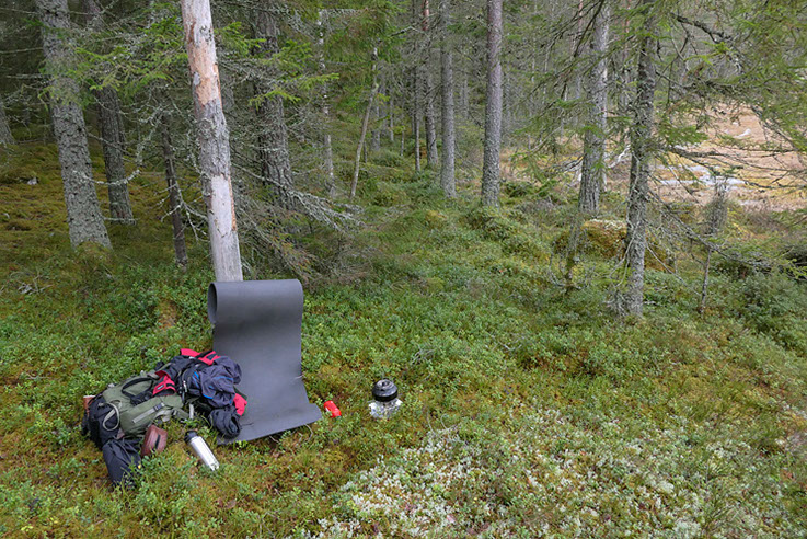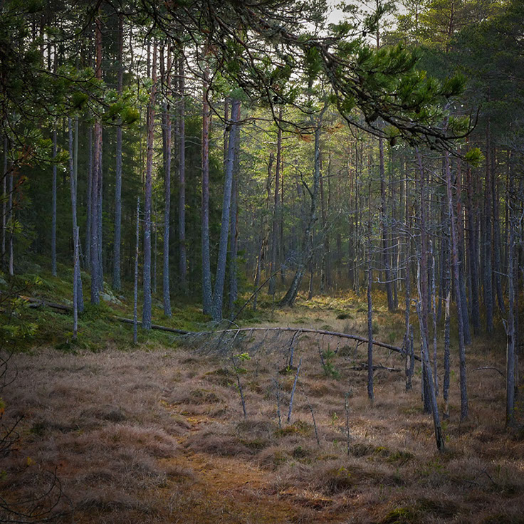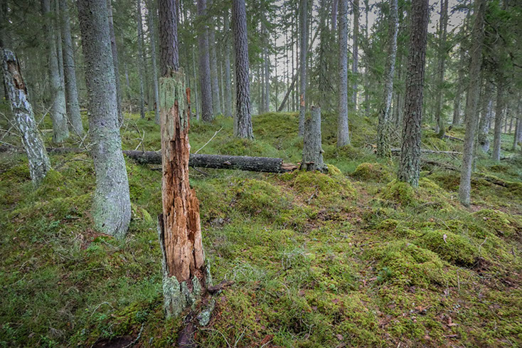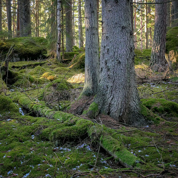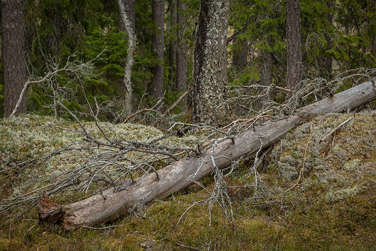På med ryggsäcken och iväg de tre kilometrarna av hyggen och tallplanteringar mot målet – den gamla skogen. Det är inte många som vet var den ligger och den verkar vara bortglömd för här finns inte ett spår av vare sig traktorer eller skogsmaskiner. Så här har den säkert sett ut i långa tider och den har med all visshet aldrig varit kalhuggen. Säkert har skogselden dragit fram här för länge sedan, det vittnar några fortfarande svartbrända tyrestubbar om som säkert har flera hundra år på nacken. Väl inne i den gamla skogen blir tillvaron rent Rosenbergsk och när jag vandrar på de smaragdgröna lätt sviktande tuvorna skulle jag inte se det som något märkvärdigt