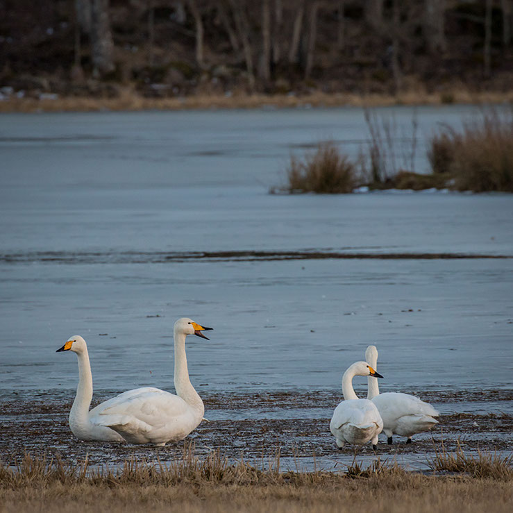 Har man tur, och då menar jag tur, så kan man få ynnesten att uppleva den mindre sångsvanen. Just nu hälsar den på här i Östergötland och kan ses i våtmarkerna runt Tinnerö, vid Svartåmynningens naturreservat och vid några andra fågellokaler i länet. De ses varje vår i några tiotal individer i länet men inte fler och alltid tillsammans med den större sångsvanens flockar.