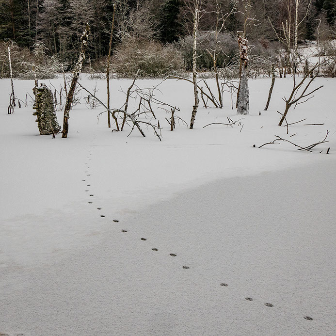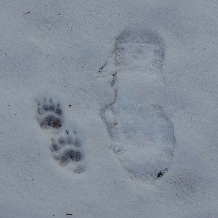 Grävlingen har varit ute och luftat sig någon gång under gårdags eftermiddagen när det var mildgrader. Nu morgonen efter har det frusit och grävlingens spår är permanentade i snön när vi möts.