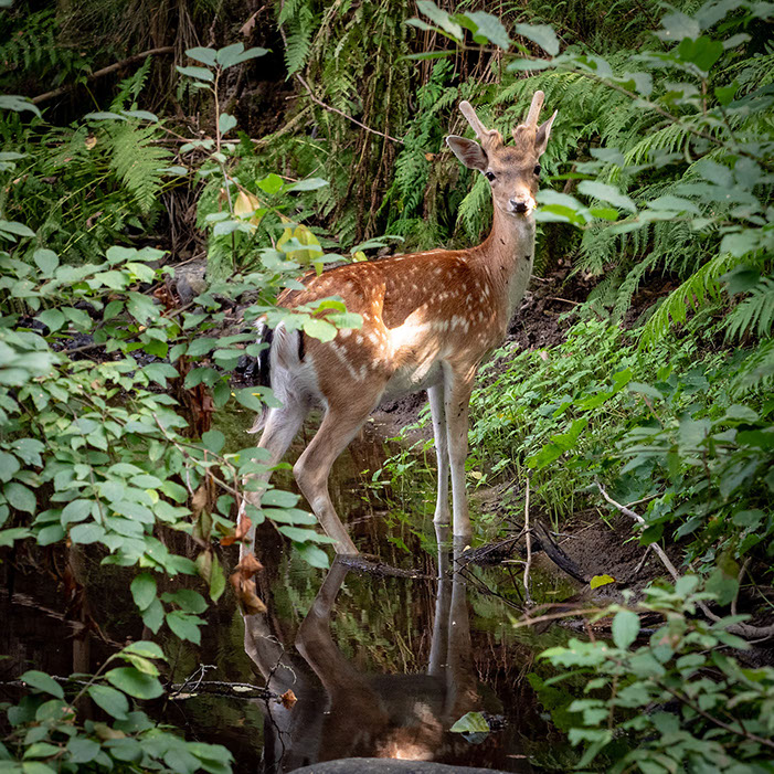Dagens jakt på svalka i den 33 gradiga värmen förde mig till den djungellika Stjärnorpsravinen. Med åskan mullrande i fjärran sökte jag svalka i bäckens vatten och det var då jag mötte dovhjorten som hade samma planer som jag.