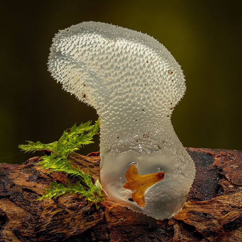 Hittade i dag ett litet skogsväsen och med näsan i den fuktiga mossan kunde jag möta den bedårande Gelétaggingen Pseudohydnum gelatinosum.....