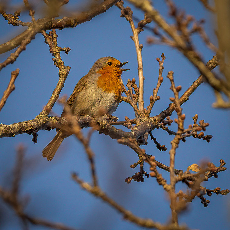I det sista varma kvällsljuset sitter han där rödhaken och låter sin silvriga sång rinna ut över gläntan. Än så länge är han solisten i aprilkvällen bara taltrasten hjälper till från sin grantopp. Men bara om några veckor är kören fulltalig.....